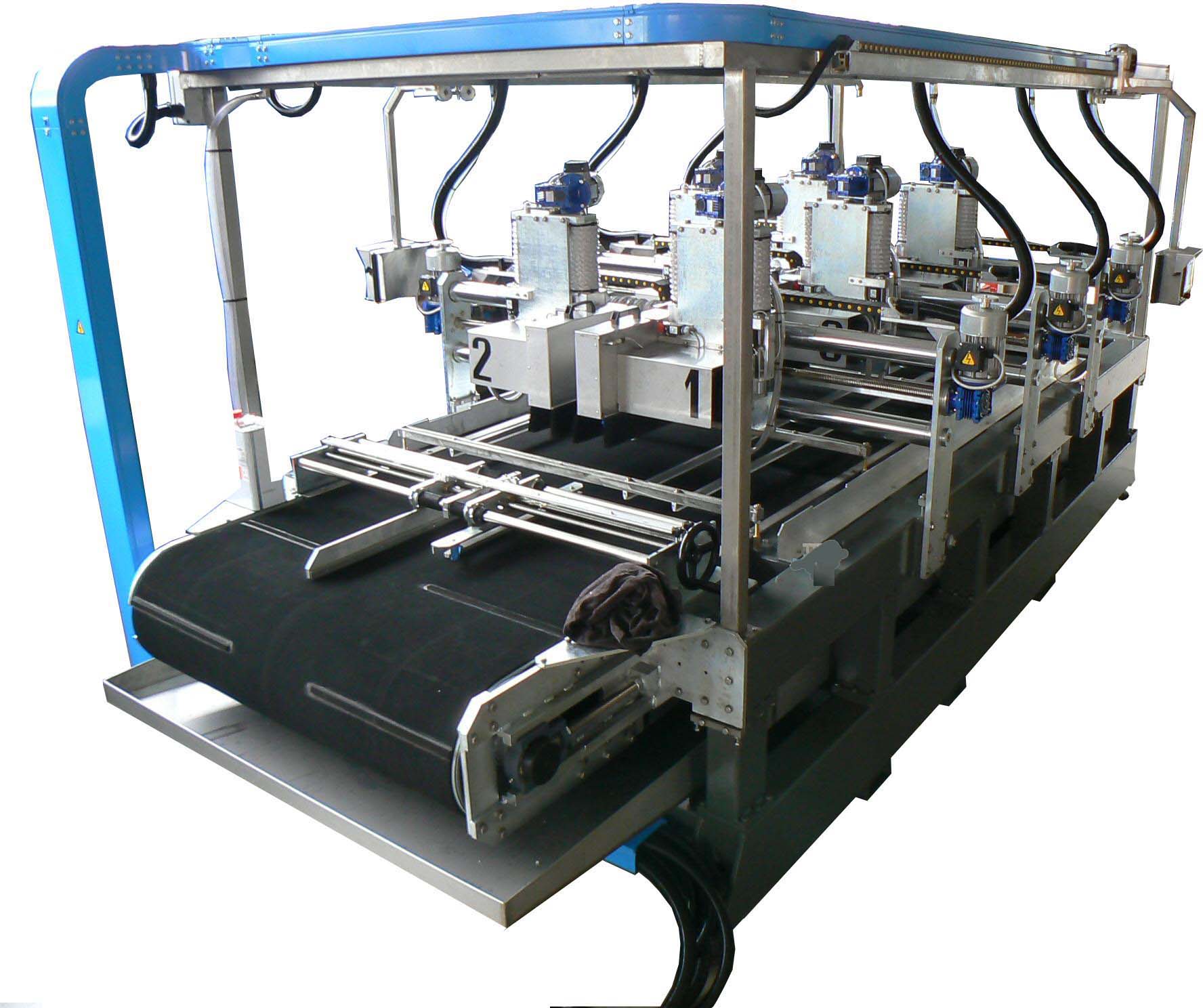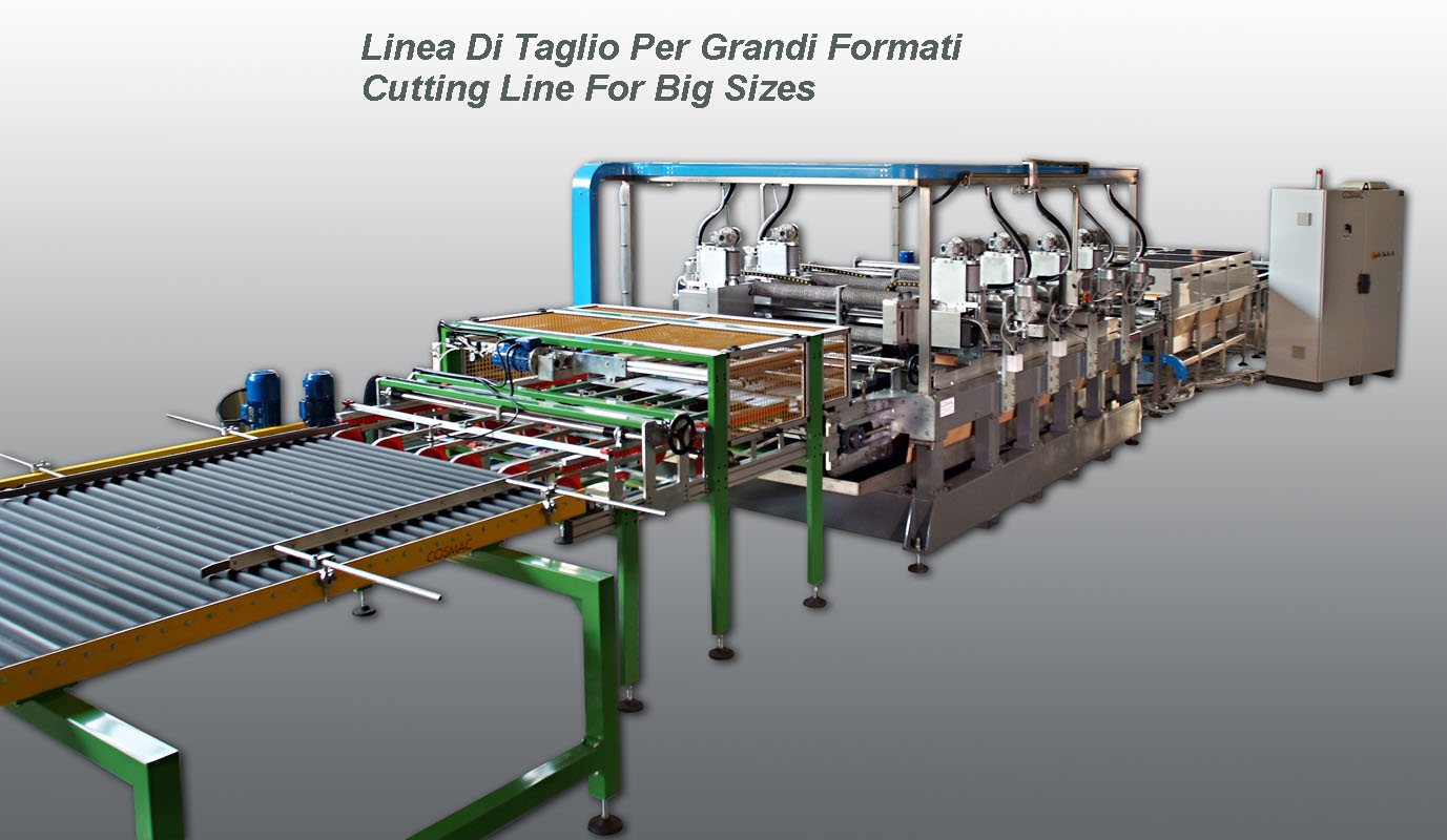 Macchina da taglio per grandi formati, con nastro di trasporto disponibile in varie misure. La macchina ha 6 teste da taglio, ognuna delle quali ha una potenza di 4Kw. Sulla macchina, come optional, si può richiedere il posizionamento automatico di misura delle teste, impostandolo dal quadro elettrico, su schermo touch screen.